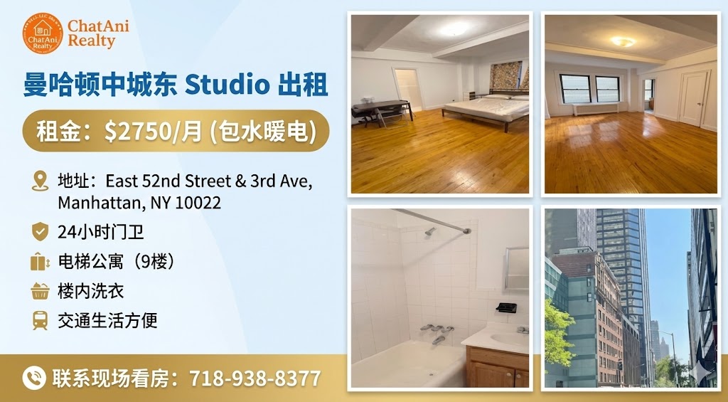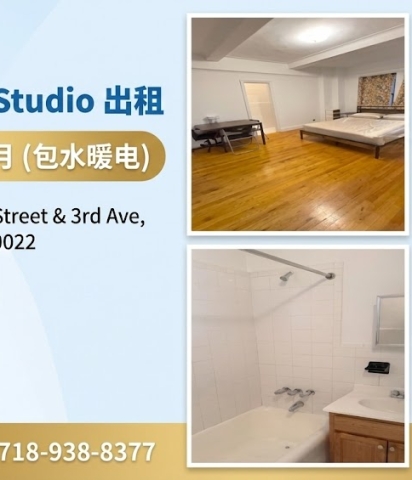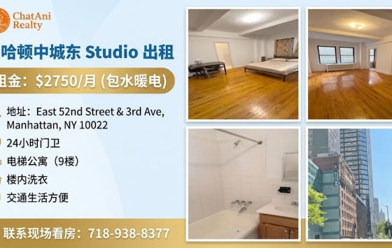 🏠 曼哈顿中城超值Studio出租 $2750全包(包水电暖)!近Grand Central,步行5-8分钟