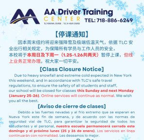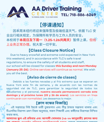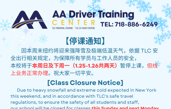 因本周末纽约将迎来强降雪及极端低温天气,依据TLC安全出行相关规定,为保障所有学员