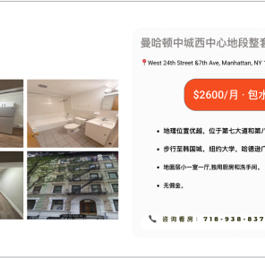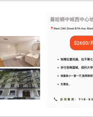 曼哈顿Chelsea整套小一室一厅公寓出租2600