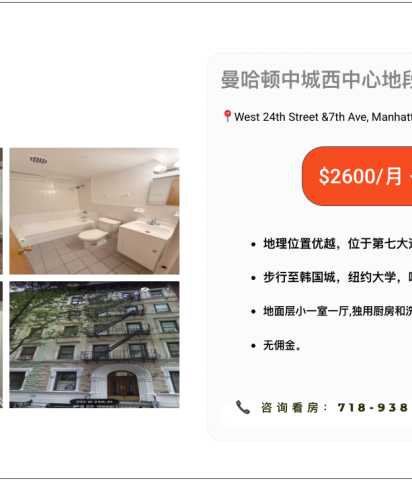 曼哈顿Chelsea整套小一室一厅公寓出租_$2600/月包水暖 @West 24St &7th Ave,NY 10011